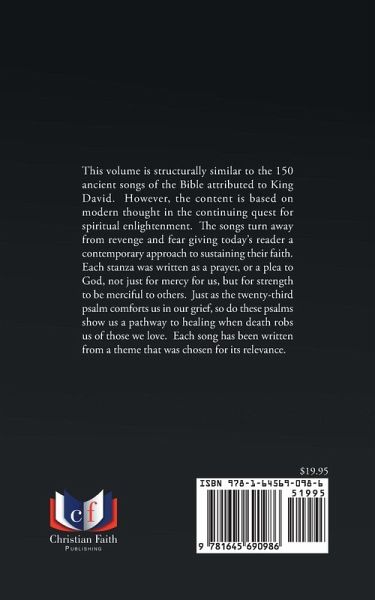 This volume is structurally similar to the 150 ancient songs of the Bible attributed to King David. However, the content is based on modern thought in the continuing quest for spiritual enlightenment. The songs turn away from revenge and fear giving today's reader a contemporary approach to sustaining their faith. Each stanza was written as a prayer, or a plea to God, not just for mercy for us, but for strength to be merciful to others. Just as the twenty-third psalm comforts us in our grief, so do these psalms show us a pathway to healing when death robs us of those we love. Each song has been written from a theme that was chosen for its relevance.