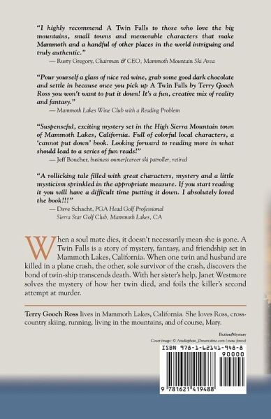 When a soul mate dies, it doesn't necessarily mean she is gone. A Twin Falls is a story of mystery, fantasy, and friendship set in Mammoth Lakes, California. When one twin and husband are killed in a plane crash, the other, sole survivor of the crash, discovers the bond of twin-ship transcends death. With her sister's help, Janet Westmore solves the mystery of how her twin died, and foils the killer's second attempt at murder.