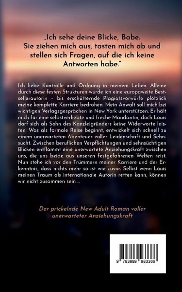„Ich sehe deine Blicke, Babe. Sie ziehen mich aus, tasten mich ab und stellen sich Fragen, auf die ich keine Antworten habe." Der prickelnde New Adult Roman voller unerwarteter Anziehungskraft Ich liebe Kontrolle und Ordnung in meinem Leben. Alleine durch diese festen Strukturen wurde ich eine europaweite Bestsellerautorin – bis erschütternde Plagiatsvorwürfe plötzlich meine komplette Karriere bedrohen. Mein Anwalt soll mich bei wichtigen Verlagsgesprächen in New York unterstützen. Er hält mich für eine selbstverliebte und freche Mandantin, doch Louis darf sich als Sohn des Kanzleigründers keine Widerworte leisten. Was als formale Reise beginnt, entwickelt sich schnell zu einem unerwarteten Abenteuer voller Leidenschaft und Sehnsucht. Zwischen beruflichen Verpflichtungen und sehnsüchtigen Blicken entflammt eine unerwartete Anziehungskraft zwischen uns, die uns beide aus unseren festgefahrenen Welten reist. Nun stehe ich vor den Trümmern meiner Karriere und der Erkenntnis, dass nichts mehr so ist wie zuvor. Selbst wenn Louis meinen Traum als internationale Autorin retten kann, können wir nicht zusammen sein … Erste Leser:innenstimmen „Absolut packend! Konnte es nicht aus der Hand legen. Die perfekte Mischung aus Romantik und Drama." „Die Charakterentwicklung von Louis ist beeindruckend. Eine Geschichte über Selbstfindung und das, was wirklich zählt." „Eine Bestsellerautorin ist wegen Plagiatsverdacht vor Gericht und wird von einem unwiderstehlichen Anwalt vertreten. Das Buch hält ein, was es verspricht! Forbidden Lovers par excellence!" „Tolle Mischung aus Liebesdrama und beruflichem Intrigengeflecht. Die Charaktere sind tiefgründig und die Story hält einen bis zum Schluss gefangen."