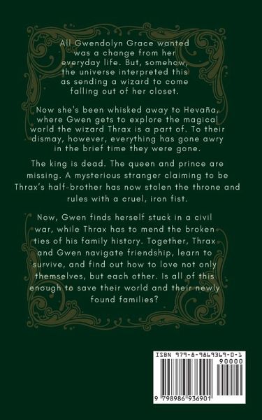 This is the story of a young college-aged woman, Gwendolyn Grace, and how she gets caught up in the troubles of the magical world of Hevana. She is swept away by the wizard, Thrax, to his world. They find out that while he was in her world, a whole two weeks had passed in that time. During that time, another wizard attacked the kingdom, killing the king and sending the queen, Thrax's mother, and the crown prince, Thrax's half-brother Aaheer, into hiding. Thrax and Gwen team up with Aaheer to build an army and defeat the wizard to save the kingdom. This book features LGBTQ+, POC, and disabled characters. There is asexual, pansexual, bisexual, and lesbian representation mentioned openly. The book also handles themes of found family This book also features adult themes like sex and more serious issues such as escaping abuse and grief. This book is intended to be something that people can feel connected to and promote diversity within fantasy fiction. This book is also intended to be a sort of coming-of-age story for college-aged adults who are trying to figure out who they are and create their found family.