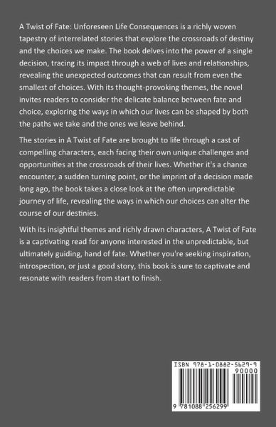 A Twist of Fate: Unforeseen Life Consequences is a richly woven tapestry of interrelated stories that explore the crossroads of destiny and the choices we make. The book delves into the power of a single decision, tracing its impact through a web of lives and relationships, revealing the unexpected outcomes that can result from even the smallest of choices. With its thought-provoking themes, the novel invites readers to consider the delicate balance between fate and choice, exploring the ways in which our lives can be shaped by both the paths we take and the ones we leave behind. The stories in A Twist of Fate are brought to life through a cast of compelling characters, each facing their own unique challenges and opportunities at the crossroads of their lives. Whether it's a chance encounter, a sudden turning point, or the imprint of a decision made long ago, the book takes a close look at the often unpredictable journey of life, revealing the ways in which our choices can alter the course of our destinies. With its insightful themes and richly drawn characters, A Twist of Fate is a captivating read for anyone interested in the unpredictable, but ultimately guiding, hand of fate. Whether you're seeking inspiration, introspection, or just a good story, this book is sure to captivate and resonate with readers from start to finish.