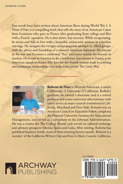 Few novels have been written about American flyers during World War I. A Twist of Fate is a compelling book that tells the story of an American Cajun from Louisiana who goes to France after graduating from college and flies with a French squadron. He is shot down, but recovers. While recuperating, he meets and falls in love with a beautiful, aristocratic woman in a loveless marriage. He navigates the intrigue and propaganda attempts by Allied groups, with the advice and friendship of a talented American diplomat. He returns to the war and becomes a celebrated "Ace" and earns medals for bravery…mehr