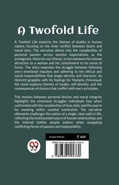 A Twofold Life explores the themes of duality in human nature, focusing on the inner conflict between desire and moral duty. The narrative delves into the complexities of personal passion versus societal expectations, as the protagonist, Heinrich von Ottmar, is torn between his intense attraction to a woman and his commitment to his sense of honor. The story examines the struggle between following one's emotional impulses and adhering to the ethical and social responsibilities that shape identity and character. As Heinrich grapples with his feelings for Madame d'Anneaud, the novel explores themes of loyalty, self-identity, and the consequences of choices that conflict with one's principles. This tension between personal desires and moral integrity highlights the emotional struggles individuals face when confronted with the complexities of love, duty, and the search for meaning within societal constraints. The narrative ultimately challenges the notion of a single, clear path in life, reflecting the multifaceted nature of human relationships and the internal battles people endure when navigating conflicting forces of passion and responsibility.
