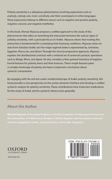 Polarity sensitivity is a ubiquitous phenomenon involving expressions such as anybody, nobody, ever, never, somebody and their counterparts in other languages. These expressions belong to different classes such as negative and positive polarity, negative concord, and negative indefinites. In this book, Ahmad Alqassas proposes a unified approach to the study of this phenomenon that relies on examining the interaction between the various types of polarity sensitivity, with a particular focus on Arabic. Alqassas shows that treating this interaction is fundamental for scrutinizing their licensing conditions. Alqassas draws on data from Standard Arabic and the major regional dialects represented by Jordanian, Egyptian, Moroccan, and Qatari. Through the (micro)comparative approach, Alqassas explains the distributional contrasts with a minimal set of universal syntactic operations such as Merge, Move, and Agree. He also considers a fine-grained inventory of negative formal features for polarity items and their licensors. These simple features paint a complex landscape of polarity and lead to important conclusions about syntactic computation. By engaging with the rich but under-studied landscape of Arabic polarity sensitivity, this book provides a new perspective on the syntax-semantic interface and develops a unified syntactic analysis for polarity sensitivity. These contributions have important implications for the study of Arabic and for syntactic theory more generally.