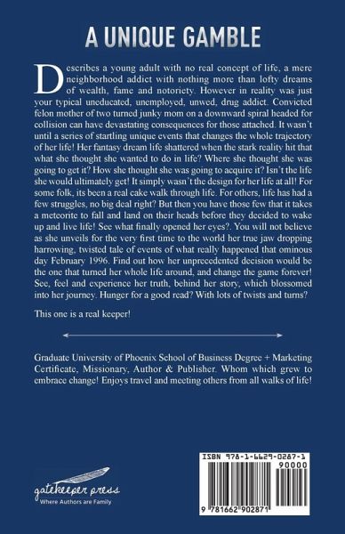 A Unique Gamble Describes a life of utter turbulence for a 5 yr old girl, from the outset with a family steeped in dysfunction, alcoholics, abusers, molestation, rape and all levels of maltreatment. Only to be discarded like refuse by her biological family, by the tender age of 11 was thrust to the ward of the state, Condemned to juvenile life, consisting of mostly nothing but foster care and multiple co- ed group homes for unwanted children. Then as an adult, with no real concept of life became a mere street hustler with nothing more than lofty dreams of wealth, fame, & notoriety. However in reality was just your typical uneducated, unemployed, unwed, drug addict. Convicted felon mother of two turned junky mom on a downward spiral headed for collision can have devastating consequences for those attached. It wasn't until a series of startling unique events that changes the whole trajectory of her life! Her fantasy dream life shattered when the stark reality hit that what she thought she wanted to do in life? Where she thought she was going to get it? How she thought she was going to acquire it? Isn't the life she would ultimately get! It simply wasn't the design for her life at all! For some folk, its been a real cake walk through life. For others, life has had a few struggles, no big deal right? But then you have those few that it takes a meteorite to fall and land on their heads before they decided to wake up and live life! See what finally opened her eyes?. You will not believe as she unveils for the very first time to the world her true jaw dropping harrowing, twisted tale of events of what really happened that ominous day February 1996. Find out how her unprecedented decision would be the one that turned her whole life around, and change the game forever! See, feel and experience her truth, behind her story, which blossomed into her journey. Hunger for a good read? With lots of twists and turns? This one is a real keeper!