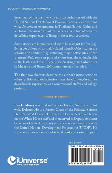 Seventeen of the twenty-two years the author served with the United Nations Development Programme were spent with his wife, Delores, on assignments in Thailand, Samoa, China and Vietnam. The main focus of the book is a collection of vignettes describing experiences of living in these four countries. Some stories are humorous and are to be read just for fun (e.g., living conditions on a small isolated island). Other stories are serious and somber (e.g., retracing major battle sites of the Vietnam War). Some are pure adventure (e.g., the midnight visit to the leatherback turtle beach). Fascinating travel adventures in Malaysia and Burma (Myanmar) are also included. The first two chapters describe the author's introduction to values, politics and social justice issues. In addition, the author describes his experiences as a congressional staffer and college professor.