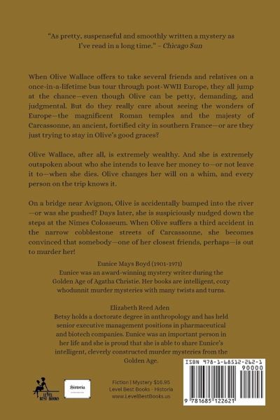 When Olive Wallace offers to take several friends and relatives on a once-in-a-lifetime bus tour through post-WWII Europe, they all jump at the chance-even though Olive can be petty, demanding, and judgmental. But do they really care about seeing the wonders of Europe-the magnificent Roman temples and the majesty of Carcassonne, an ancient, fortified city in southern France-or are they just trying to stay in Olive's good graces? Olive Wallace, after all, is extremely wealthy. And she is extremely outspoken about who she intends to leave her money to-or not leave it to-when she dies. Olive changes her will on a whim, and every person on the trip knows it. On a bridge near Avignon, Olive is accidentally bumped into the river-or was she pushed? Days later, she is suspiciously nudged down the steps at the Nimes Colosseum. When Olive suffers a third accident in the narrow cobblestone streets of Carcassonne, she becomes convinced that somebody-one of her closest friends, perhaps-is out to murder her!