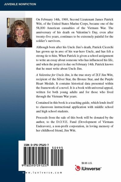 On February 14th, 1969, Second Lieutenant James Patrick Witt, of the United States Marine Corps, became one of the 58,000 American casualties of the Vietnam War. The anniversary of his death on Valentine's Day, even after twenty-five years, continues to be extremely painful for the soldier's survivors. Although born after his Uncle Jim's death, Patrick Cicerchi has grown up in awe of his war-hero Uncle, and has felt a strong tie to him. When Patrick is given a school assignment to write an essay about someone who has influenced his life, and when the project is due on February 14th. Patrick knows that he must write about Uncle Jim. A Valentine for Uncle Jim, is the true story of 2LT Jim Witt, recipient of the Silver Star, the Bronze Star, and the Purple Heart Medals. It contains historical data presented within the framework of a novel. It is a book with universal appeal, written for both young adults and for those who lived through the Vietnam War years. Contained in this book is a teaching guide, which lends itself to classroom instructional application with middle school and high school students. Proceeds from the sale of this book will be donated by the author, to the D.O.V.E. Fund (Development of Vietnam Endeavors), a non-profit corporation, in loving memory of her childhood friend, Jim Witt.