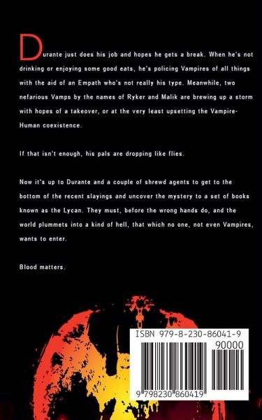 "A vibrant and thrilling vampire romp" (Booklife) Durante just does his job and hopes he gets a break. When he's not drinking or enjoying some good eats, he's policing Vampires of all things with the aid of an Empath who's not really his type. Meanwhile, two nefarious Vamps by the names of Ryker and Malik are brewing up a storm with hopes of a takeover, or at the very least upsetting the Vampire-Human Coexistence. If that isn't enough, his pals are dropping like flies. Now it's up to Durante and a couple of shrewd agents to get to the bottom of the recent slayings and uncover the mystery to a set of books known as the Lycan. They must, before the wrong hands do, and the world plummets into a kind of hell, that which no one, not even Vampires, wants to enter. Blood matters.