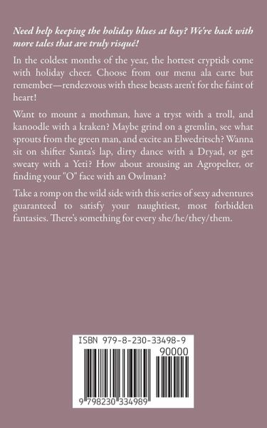 Need help keeping the holiday blues at bay? We're back with more tales that are truly risqué! In the coldest months of the year, the hottest cryptids come with holiday cheer. Choose from our menu ala carte but remember-rendezvous with these beasts aren't for the faint of heart! Want to mount a mothman, have a tryst with a troll, and kanoodle with a kraken? Maybe grind on a gremlin, see what sprouts from the green man, and excite an Elwedritsch? Wanna sit on shifter Santa's lap, dirty dance with a Dryad, or get sweaty with a Yeti? How about arousing an Agropelter, or finding your "O" face with an Owlman? Take a romp on the wild side with this series of sexy adventures guaranteed to satisfy your naughtiest, most forbidden fantasies. There's something for every she/he/they/them.