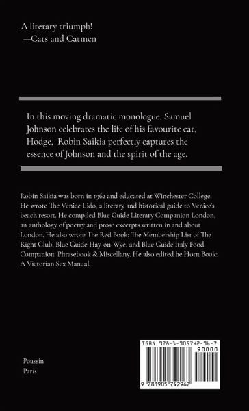 In this moving dramatic monologue, Samuel Johnson celebrates the life of his favourite cat, Hodge, Robin Saikia perfectly captures the essence of Johnson and the spirit of the age. Johnson tells us how he came to like cats and how he came to own Hodge. He also gives a spirited account of his adventures in London coffee houses, his friends and enemies, and his passion for liberty and the rights of animals. There is an explanatory Introduction, and five appendices with relevant excerpts from the work of Leigh Hunt, Christopher Smart, Susan Coolidge, Percival Stockdale and Jeremy Bentham.