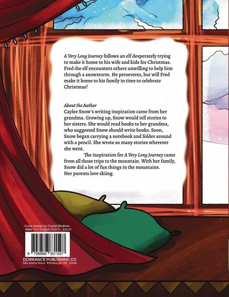 A Very Long Journey follows an elf desperately trying to make it home to his wife and kids for Christmas. Fred the elf encounters others unwilling to help him through a snowstorm. He perseveres, but will Fred make it home to his family in time to celebrate Christmas? About the Author Caylee Snow's writing inspiration came from her grandma. Growing up, Snow would tell stories to her sisters. She would read books to her grandma, who suggested Snow should write books. Soon, Snow began carrying a notebook and folder around with a pencil. She wrote so many stories wherever she went. The inspiration for A Very Long Journey came from all those trips to the mountain. With her family, Snow did a lot of fun things in the mountains. Her parents love skiing.