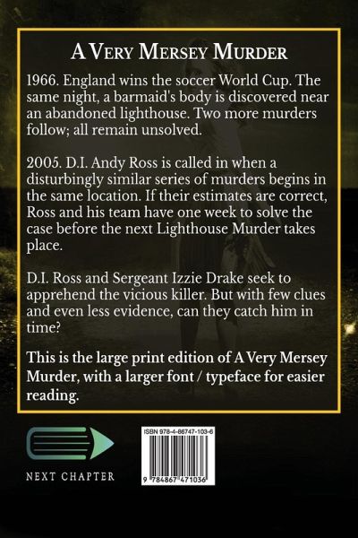 1966. England wins the soccer World Cup. The same night, a barmaid's body is discovered near an abandoned lighthouse. Two more murders follow; all remain unsolved. 2005. D.I. Andy Ross is called in when a disturbingly similar series of murders begins in the same location. If their estimates are correct, Ross and his team have one week to solve the case before the next Lighthouse Murder takes place. D.I. Ross and Sergeant Izzie Drake seek to apprehend the vicious killer. But with few clues and even less evidence, can they catch him in time? This is the large print edition of A Very Mersey Murder, with a larger font / typeface for easier reading.¿