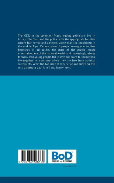 The GDR in the seventies. Many leading politicians live in luxury. The Stasi and the police with the appropriate facilities ensure fear, terror and violence, worse than the inquisition in the middle Ages. Denunciation of people among one another flourishes in all colors, the mass of the people makes unrestrained use of the national wealth and increasingly refuses to work. Two young people fall in love and want to spend their life together in a country where they are free from political constraints. What the two have to experience and suffer on this very dangerous path is hell and horror itself.…mehr