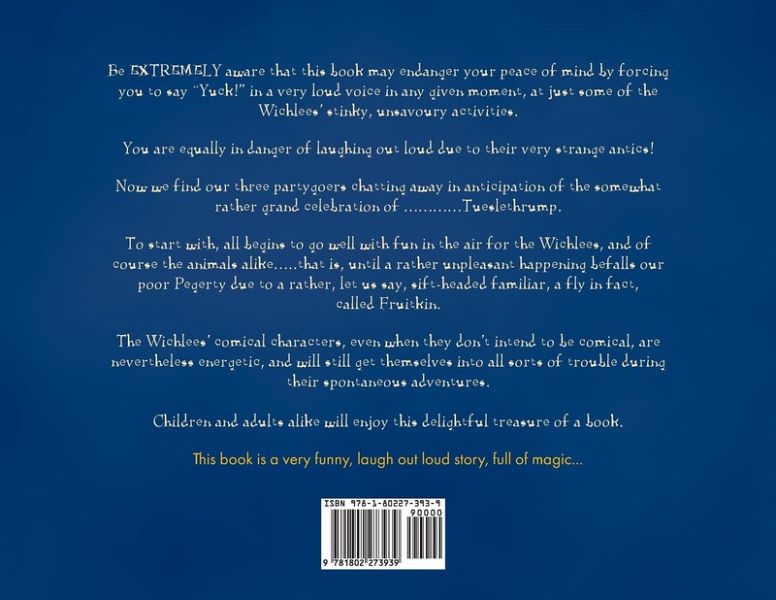 Be EXTREMELY aware that this book may endanger your peace of mind by forcing you to say "Yuck!" in a very loud voice in any given moment, at just some of the Wichlees' stinky, unsavoury activities. You are equally in danger of laughing out loud due to their very strange antics! Now we find our three partygoers chatting away in anticipation of the somewhat rather grand celebration of ............Tueslethrump. To start with, all begins to go well with fun in the air for the Wichlees, and of course the animals alike.....that is, until a rather unpleasant happening befalls our poor Pegerty due to a rather, let us say, sift-headed familiar, a fly in fact, called Fruitkin. The Wichlees' comical characters, even when they don't intend to be comical, are nevertheless energetic, and will still get themselves into all sorts of trouble during their spontaneous adventures. Children and adults alike will enjoy this delightful treasure of a book.
