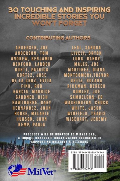A Veteran's Story - True Stories of Strength, Courage and Inspiration This book is a touching and inspiring anthology written by 30 veterans who have served in the United States Military. This is a salute to veterans of all eras and branches highlighting unforgettable experiences and bravery of those who have fought for our country and risked their lives for our freedom. Authors include transitioning veterans, active-duty military, gold star families, women in the military, Vietnam War Veterans, combat veterans and peacetime veterans. Some stories reflect on great loss, courage, challenges and honor. Others emulate a level of patriotism and love for their country that is unmatched. Some stories have never been shared until now. All of the accounts are amazing and inspirational.Contributing Authors Andersen, Joe Anderson, Tom Andrew, Benjamin Benford, Larock Burtt, Patrick Cortez, Jose De La Cruz, Evita Fink, Rod Garcia, Maurice Gardner, Rich Hawthorne, Gary Hernandez, John House, Melanie Hudson, John Kemp, Paula Leal, Sandra Lively, Bryon Lung, Randy Males, Joe Martinez, Diana Montgomery, Trevor Ortiz, Roland Rickman, Dereck Romley, Joe Samuelson, Ed Washington, Chuck White, Jason Winfield, Travis Wisehart, Jeremy