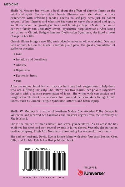 Sheila W. Mooney has written a book about the effects of chronic illness on the mind and spirit. She has eight chronic illnesses and talks about her own experiences with refreshing candor. There's no self-pity here, just an honest account of her illnesses and what she has come to know about mind and spirit. You'll read about her growing up in a small farming village in Maine, then on to her own family and ultimately, several psychiatric hospitalizations. After losing her career to Chronic Fatigue Immune Dysfunction Syndrome, she faced a great change in her life. Chronic illness brings a new life, and suddenly leaves an old one behind. One may look normal, but on the inside is suffering and pain. The great accumulation of suffering includes: * Grief * Isolation and Loneliness * Anxiety * Depression * Economic Stress * Pain After the author chronicles her story, she has some basic suggestions to help those who are suffering invisibly. She intertwines two stories, her private subjective thoughts with a concise presentation of ideas. She writes with compassion and imagination. This book is a must-read for those and their caretakers facing chronic illness, such as Chronic Fatigue Syndrome, arthritis and brain injury. .