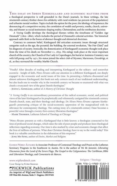 This essay on Soren Kierkegaard and economic matters from a theological perspective is well grounded in the Dane's journals. In these writings, the late nineteenth-century thinker shows his solidarity with rural residents (90 percent of the population) and urbanite menial workers. Topics include the option for the poor; the ideology of impotence; the denouncing of a competitive society; the correlation of wealth and poverty; media, church, university, and theater as social institutions shaping reality; Christendom; and the retribution doctrine. A Vexing Gadfly develops the theological themes within the timeframe of ""Golden Age Denmark"" (1800-1860), which includes the period of Denmark's colonial activities. The historical approach adds flesh to the bones of abstract thought and ahistorical doctrines. Contrary to common belief, Kierkegaard did articulate economic issues through structural categories such as the age, the pyramid, the building, the external revolution, ""the Fire Chief,"" and his diagnosis of society. Ironically, the domestication of Kierkegaard's economic thought took place from the time of his death on November 11, 1855. His eulogy took place at the most important church of the country, the Church of Our Lady in Copenhagen; his burial at Assistens Cemetery was with full pomp; and by 1971, his statue joined the select club of Mynster, Martensen, Grundvigt, et al., as they surround the wealthy Marble Church.