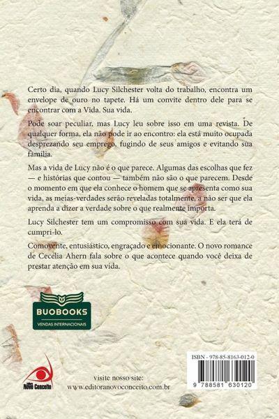 Certo dia, quando Lucy Silchester volta do trabalho, há um envelope de ouro no tapete. E um convite dentro dele para se encontrar com a Vida. Sua vida. Pode soar peculiar, mas Lucy leu sobre isso em uma revista. De qualquer forma, ela não pode ir ao encontro: está muito ocupada desprezando seu emprego, fugindo de seus amigos e evitando sua família. Mas a vida de Lucy não é o que parece. Algumas das escolhas que fez - e histórias que contou - também não são o que parecem. Desde o momento em que ela conhece o homem que se apresenta como sua vida, suas meias-verdades são reveladas totalmente - a não ser que ela aprenda a dizer a verdade sobre o que realmente importa. Lucy Silchester tem um compromisso com sua vida - e ela terá de cumpri-lo.