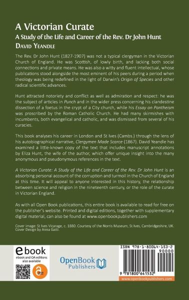 The Rev. Dr John Hunt (1827-1907) was not a typical clergyman in the Victorian Church of England. He was Scottish, of lowly birth, and lacking both social connections and private means. He was also a witty and fluent intellectual, whose publications stood alongside the most eminent of his peers during a period when theology was being redefined in the light of Darwin's Origin of Species and other radical scientific advances. Hunt attracted notoriety and conflict as well as admiration and respect: he was the subject of articles in Punch and in the wider press concerning his clandestine dissection of a foetus in the crypt of a City church, while his Essay on Pantheism was proscribed by the Roman Catholic Church. He had many skirmishes with incumbents, both evangelical and catholic, and was dismissed from several of his curacies. This book analyses his career in London and St Ives (Cambs.) through the lens of his autobiographical narrative, Clergymen Made Scarce (1867). David Yeandle has examined a little-known copy of the text that includes manuscript annotations by Eliza Hunt, the wife of the author, which offer unique insight into the many anonymous and pseudonymous references in the text. A Victorian Curate: A Study of the Life and Career of the Rev. Dr John Hunt is an absorbing personal account of the corruption and turmoil in the Church of England at this time. It will appeal to anyone interested in this history, the relationship between science and religion in the nineteenth century, or the role of the curate in Victorian England.