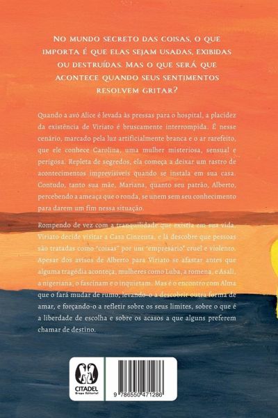 No mundo secreto das coisas, o que importa é que elas sejam usadas, exibidas ou destruídas. Mas o que será que acontece quando seus sentimentos resolvem gritar? Quando a avó Alice é levada às pressas para o hospital, a placidez da existência de Viriato é bruscamente interrompida. É nesse cenário, marcado pela luz artificialmente branca e o ar rarefeito, que ele conhece Carolina, uma mulher misteriosa, sensual e perigosa. Repleta de segredos, ela começa a deixar um rastro de acontecimentos imprevisíveis quando se instala em sua casa. Contudo, tanto sua mãe, Mariana, quanto seu patrão, Alberto, percebendo a ameaça que o ronda, se unem sem seu conhecimento para darem um fim nessa situação. Rompendo de vez com a tranquilidade que existia em sua vida, Viriato decide visitar a Casa Cinzenta, e lá descobre que pessoas são tratadas como ¿coisas¿ por um ¿empresáriö cruel e violento. Apesar dos avisos de Alberto para Viriato se afastar antes que alguma tragédia aconteça, mulheres como Luba, a romena, e Asali, a nigeriana, o fascinam e o inquietam. Mas é o encontro com Alma que o fará mudar de rumo, levando-o a descobrir outra forma de amar, e forçando-o a refletir sobre os seus limites, sobre o que é a liberdade de escolha e sobre os acasos a que alguns preferem chamar de destino.