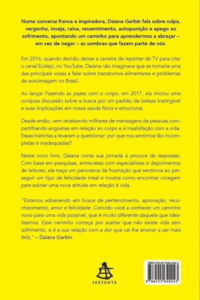 DA MESMA AUTORA DE FAZENDO AS PAZES COM O CORPO. Numa conversa franca e inspiradora, Daiana Garbin fala sobre culpa, vergonha, inveja, raiva, ressentimento, autopunição e apego ao sofrimento, apontando um caminho para aprendermos a abraçar ¿ em vez de negar ¿ as sombras que fazem parte de nós. ¿Estamos adoecendo em busca de pertencimento, aprovação, reconhecimento, amor e felicidade. Convido você a conhecer um caminho novo para uma vida possível, que é muito diferente daquela que idealizamos. Esse caminho começa por aceitar que não existe vida sem sofrimento, e é a sua relação com a dor que vai lhe ensinar a ser mais feliz.¿ ¿ Daiana Garbin Em 2016, quando decidiu deixar a carreira de repórter de TV para criar o canal EuVejo, no YouTube, Daiana não imaginava que se tornaria uma das principais vozes a falar sobre transtornos alimentares e problemas de autoimagem no Brasil. Ao lançar Fazendo as pazes com o corpo, em 2017, ela iniciou uma corajosa discussão sobre a busca por um padrão de beleza inatingível e suas implicações em nossa saúde física e emocional. Desde então, recebeu milhares de mensagens de pessoas compartilhando suas angústias em relação ao corpo e à insatisfação com a vida. Essas histórias a levaram a questionar: por que nos sentimos tão incompletas e inadequadas? Em A vida perfeita não existe, Daiana divide conosco sua jornada à procura de respostas. Com base em estudos, pesquisas, entrevistas com especialistas e depoimentos de leitores, ela traça um panorama da frustração que sentimos ao perseguir um tipo de felicidade irreal e mostra como encontrar coragem para adotar uma nova atitude em relação à vida. "Quem se arrisca a apresentar publicamente suas ideias tem que superar o medo de se expor. Dá para imaginar, então, o tamanho da coragem da Daiana Garbin, que eleva essa jornada à máxima potência ao escrever sobre seus próprios fantasmas, seus traumas, tudo o que não gostamos de contar. Ao dividir conosco esse processo, ela mostra a libertação que ele traz.¿ - Daniel Barros, psiquiatra, autor de O lado bom do lado ruim ¿Daiana Garbin nos surpreende novamente com um livro corajoso, onde abre seu coração para nos ajudar a fazer as pazes conosco.¿ - Sophie Deram, nutricionista, autora de O peso das dietas.