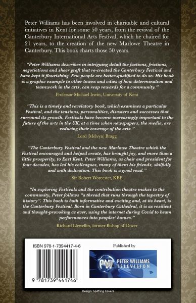 Peter Williams has been involved in charitable and cultural initiatives in Kent for some 50 years, from the revival of the Canterbury International Arts Festival, which he chaired for 21 years, to the creation of the new Marlowe Theatre in Canterbury. This book charts those 50 years. "Peter Williams describes in intriguing detail the factions, frictions, negotiations and sheer graft that re-created the Canterbury Festival and have kept it flourishing . Few people are better-qualified to do so. His book is a graphic example to other towns and cities of how determination and teamwork in the arts, can reap rewards for a community." Professor Michael Irwin, University of Kent "This is a timely and revelatory book., which examines a particular Festival, and the tensions,personalities ,disasters and successes that surround its growth. Festivals have become increasingly important to the future of the arts in the UK, at a time when newspapers, the media, are reducing their coverage of the arts." Lord (Melvyn) Bragg "The Canterbury Festival and the new Marlowe Theatre which the Festival encouraged and helped create, has brought joy, and more than a little prosperity, to East Kent. Peter Williams, as chair and president for four decades, has led his colleagues, many of them his friends, skilfully and with dedication. This book is a good read." Sir Robert Worcester, KBE ¿ "In exploring Festivals and the contribution theatre makes to the community,Peter follows "a thread that runs through the tapestry of history". This book is both informative and exciting and, at its heart, is the Canterbury Festival.Born in Canterbury Cathedral,it is as resilient and thought-provoking as ever. using the internet during Covid to beam performances in to peoples' homes." Richard Llewellin, former Bishop of Dover