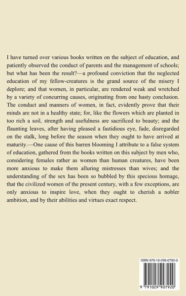 I have turned over various books written on the subject of education, and patiently observed the conduct of parents and the management of schools; but what has been the result?—a profound conviction that the neglected education of my fellow-creatures is the grand source of the misery I deplore; and that women, in particular, are rendered weak and wretched by a variety of concurring causes, originating from one hasty conclusion. The conduct and manners of women, in fact, evidently prove that their minds are not in a healthy state; for, like the flowers which are planted in too rich a soil, strength and usefulness are sacrificed to beauty; and the flaunting leaves, after having pleased a fastidious eye, fade, disregarded on the stalk, long before the season when they ought to have arrived at maturity.—One cause of this barren blooming I attribute to a false system of education, gathered from the books written on this subject by men who, considering females rather as women than human creatures, have been more anxious to make them alluring mistresses than wives; and the understanding of the sex has been so bubbled by this specious homage, that the civilized women of the present century, with a few exceptions, are only anxious to inspire love, when they ought to cherish a nobler ambition, and by their abilities and virtues exact respect.