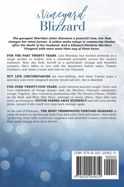 The youngest Sheridan sister discovers a powerful love, one that changes her mind forever. A widow seeks refuge in community theater after the death of her husband. And a blizzard blankets Martha's Vineyard with more snow than any of them know. For the past twenty years, Lola Sheridan has worked tirelessly as a single mother to Audrey and a renowned journalist across the eastern seaboard. Now, she finds herself in a particularly strange and beautiful scenario. She's fallen in love with the handsome Italian sailor, Tommy Gasbarro, and made a home with him on the Vineyard. But life circumstances are ever-shifting. And when Tommy pops a question Lola never imagined anyone would ask her, she is shocked. For over twenty-five years, multi-talented married couple Victor and Cora celebrated all things theater with the Martha's Vineyard community troupe. Together, they starred in productions like The Sound of Music, Fiddler on the Roof, and West Side Story, amongst so many others. Days after last year's performance, Victor passed away suddenly and left Cora terribly alone, unsure if she could ever step back onstage again. At the end of February, the most tremendous Vineyard Blizzard in years threatens to rip through both Cora and Lola's best-laid plans-- but winds up leaving them with numerous surprises and beautiful human connections that could change their lives forever. Dive into this twelfth book of the Vineyard Sunset women's fiction series by heading to Martha's Vineyard-- a backdrop of white sand and crystal blue waters that follow the stories of the Sheridan sisters. A heartwarming journey of friendship, loss, and love that will have you wanting the next book.