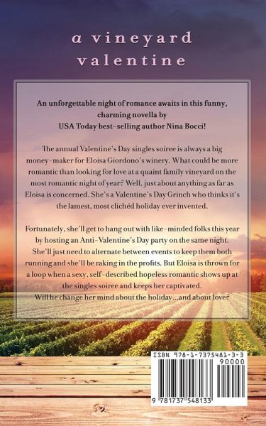 An unforgettable night of romance awaits in this funny, charming novella by USA Today best-selling author Nina Bocci! The annual Valentine's Day singles soirée is always a big money-maker for Eloisa Giordono's winery. What could be more romantic than looking for love at a quaint family vineyard on the most romantic night of year? Well, just about anything as far as Eloisa is concerned. She's a Valentine's Day Grinch who thinks it's the lamest, most cliché holiday ever invented. Fortunately, she'll get to hang out with like-minded folks this year by hosting an Anti-Valentine's Day party on the same night. She'll just need to alternate between events to keep them both running, and she'll be raking in the profits. But Eloisa is thrown for a loop when a sexy, self-described hopeless romantic shows up at the singles soirée and keeps her captivated. Will he change her mind about the holiday... and about love?