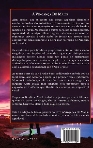 Alan Brodie, um ex-agente das Forças Especiais altamente condecorado do exército britânico, é um assassino treinado com vasta experiência em operações secretas nos campos de batalha mortais do Iraque, Afeganistão e outras zonas de guerra negáveis. Aposentado do serviço militar e agora trabalhando no setor de segurança privada, Brodie acaba de fechar um acordo para comprar um bar/restaurante à beira-mar na região de Almeria, na Espanha. Desconhecido para Brodie, o proprietário anterior estava sendo coagido por um implacável cartel de drogas a permitir que suas instalações fossem usadas como um ponto de distribuição disfarçado para seu comércio ilegal e parece que eles não aceitarão um 'não' como resposta. Então eles ficam cara a cara com o assassino profissional que é Alan Brodie. Ao tomar posse do bar, Brodie é persuadido pelo chefe de polícia local Comisário Moreno a ajudá-lo a prender esses traficantes, Moreno insistindo que ele trabalhe com a bela e enigmática sargento Anita Malik, mas ninguém está preparado para a explosão de violência que Brodie desencadeia no implacável cartel. Enquanto Brodie e Malik trabalham juntos para se infiltrar e quebrar o cartel de drogas, eles se tornam próximos, mas a sedutora Sargento Malik é tudo o que ela parece? Esta é a edição de letras grandes do livro A Vingança De Malik, com uma fonte diferenciada e maior para uma leitura mais agradável.