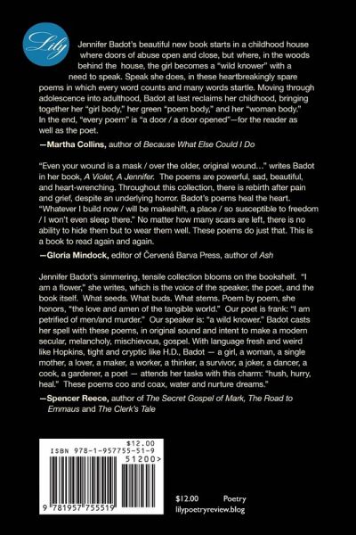 Jennifer Badot brings a clear-eyed and earthbound lyrical power to the experience of childhood sexual trauma, its often-concomitant phenomenon of adolescent promiscuity, and the grief and rage that roils beneath it all. The girl-then-woman who figures in these potent poems is a "wild knower" who desires to speak amidst societal, generational, and internalized silencing. Over the course of the book, "the poet locates herself" and speaks. In these vivid and often startling poems, Badot writes into the counterpoint and simultaneity of violation and healing, betrayal and devotion, and tenderness and rage. Ultimately, A Violet A Jennifer is Badot's fierce reclamation of self and an offering to the Beauty that saved her and saves us all.