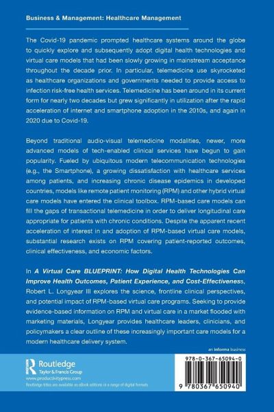 The Covid-19 pandemic prompted healthcare systems around the globe to quickly explore and subsequently adopt digital health technologies and virtual care models that had been slowly growing in mainstream acceptance throughout the decade prior. In particular, telemedicine use skyrocketed as healthcare organizations and governments needed to provide access to infection risk-free health services. Telemedicine has been around in its current form for nearly two decades but grew significantly in utilization after the rapid acceleration of internet and smartphone adoption in the 2010s, and again in 2020 due to Covid-19. Beyond traditional audio-visual telemedicine modalities, newer, more advanced models of tech-enabled clinical services have begun to gain popularity. Fueled by ubiquitous modern telecommunication technologies (e.g., the Smartphone), a growing dissatisfaction with healthcare services among patients, and increasing chronic disease epidemics in developed countries, models like remote patient monitoring (RPM) and other hybrid virtual care models have entered the clinical toolbox. RPM-based care models can fill the gaps of transactional telemedicine in order to deliver longitudinal care appropriate for patients with chronic conditions. Despite the apparent recent acceleration of interest in and adoption of RPM-based virtual care models, substantial research exists on RPM covering patient reported outcomes, clinical effectiveness, and economic factors. In A Virtual Care Blueprint: How Digital Health Technologies Can Improve Health Outcomes, Patient Experience, and Cost-Effectiveness, Robert L. Longyear III explores the science, frontline clinical perspectives, and potential impact of RPM-based virtual care programs. Seeking to provide evidence-based information on RPM and virtual care in a market flooded with marketing materials, Longyear provides healthcare leaders, clinicians, and policymakers a clear outline of these increasingly important care models for a modern healthcare delivery system.