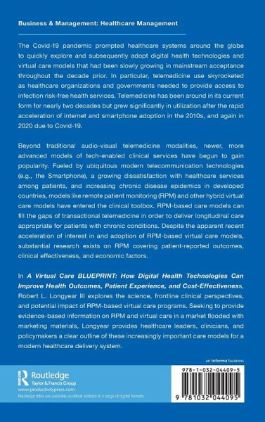 The Covid-19 pandemic prompted healthcare systems around the globe to quickly explore and subsequently adopt digital health technologies and virtual care models that had been slowly growing in mainstream acceptance throughout the decade prior. In particular, telemedicine use skyrocketed as healthcare organizations and governments needed to provide access to infection risk-free health services. Telemedicine has been around in its current form for nearly two decades but grew significantly in utilization after the rapid acceleration of internet and smartphone adoption in the 2010s, and again in 2020 due to Covid-19. Beyond traditional audio-visual telemedicine modalities, newer, more advanced models of tech-enabled clinical services have begun to gain popularity. Fueled by ubiquitous modern telecommunication technologies (e.g., the Smartphone), a growing dissatisfaction with healthcare services among patients, and increasing chronic disease epidemics in developed countries, models like remote patient monitoring (RPM) and other hybrid virtual care models have entered the clinical toolbox. RPM-based care models can fill the gaps of transactional telemedicine in order to deliver longitudinal care appropriate for patients with chronic conditions. Despite the apparent recent acceleration of interest in and adoption of RPM-based virtual care models, substantial research exists on RPM covering patient reported outcomes, clinical effectiveness, and economic factors. In A Virtual Care Blueprint: How Digital Health Technologies Can Improve Health Outcomes, Patient Experience, and Cost-Effectiveness, Robert L. Longyear III explores the science, frontline clinical perspectives, and potential impact of RPM-based virtual care programs. Seeking to provide evidence-based information on RPM and virtual care in a market flooded with marketing materials, Longyear provides healthcare leaders, clinicians, and policymakers a clear outline of these increasingly important care models for a modern healthcare delivery system.