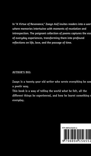 In "A Virtue of Resonance," Zaayn Asif invites readers into a world where memories intertwine with moments of revelation and introspection. The poignant collection of poems captures the essence of everyday experiences, transforming them into profound reflections on life, love, and the passage of time. Zaayn's poetic voice, shaped by a deep sense of familiarity and resonance, navigates through past memories, acceptance, and disillusionments with a unique blend of sincerity and artistry. Each poem is a testament to his journey of self discovery, offering readers a glimpse into the intimate thoughts and feelings that define his world. With themes that range from the simplicity of daily encounters to the complexities of human emotions, "A Virtue of Resonance" resonates with anyone who has ever felt the tug of nostalgia or the quiet beauty of a fleeting moment. Zaayn's words are a gentle reminder that even in the mundane, there is magic waiting to be discovered. Join Zaayn Asif on this poetic voyage, and find yourself lost in the verses that echo with the universal truths of our shared human experience.