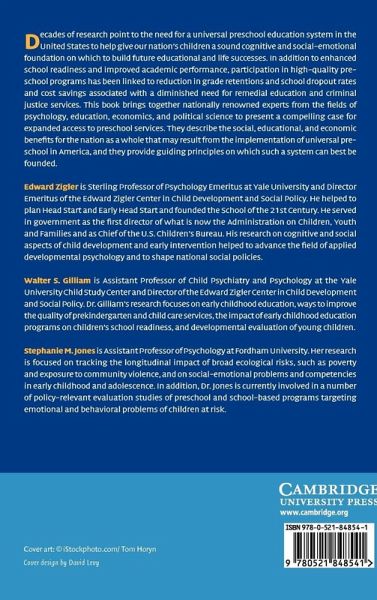 Decades of research point to the need for a universal preschool education program in the U.S. to help give our nation's children a sound cognitive and social foundation on which to build future educational and life successes. In addition to enhanced school readiness and improved academic performance, participation in high quality preschool programs has been linked with reductions in grade retentions and school drop out rates, and cost savings associated with a diminished need for remedial educational services and justice services. This 2006 book brings together nationally renowned experts from the fields of psychology, education, economics and political science to present a compelling case for expanded access to preschool services. They describe the social, educational, and economic benefits for the nation as a whole that may result from the implementation of a universal preschool program in America, and provide guiding principles upon which such a system can best be founded.