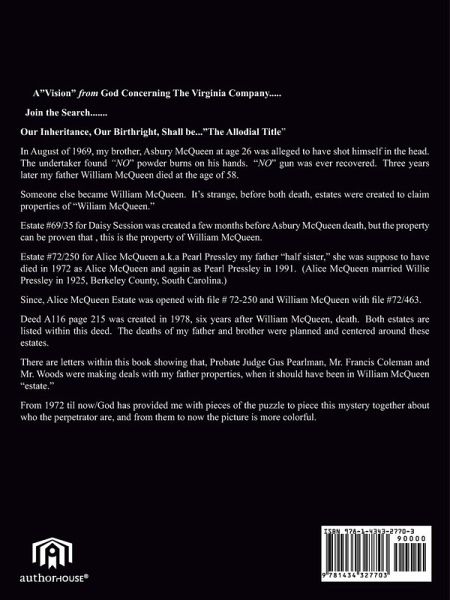 A"Vision" from God Concerning The Virginia Company..... Join the Search....... Our Inheritance, Our Birthright, Shall be..."The Allodial Title" In August of 1969, my brother, Asbury McQueen at age 26 was alleged to have shot himself in the head. The undertaker found "NO" powder burns on his hands. "NO" gun was ever recovered. Three years later my father William McQueen died at the age of 58. Someone else became William McQueen. It's strange, before both death, estates were created to claim properties of "Wiliam McQueen." Estate #69/35 for Daisy Session was created a few months before Asbury McQueen death, but the property can be proven that , this is the property of William McQueen. Estate #72/250 for Alice McQueen a.k.a Pearl Pressley my father "half sister," she was suppose to have died in 1972 as Alice McQueen and again as Pearl Pressley in 1991. (Alice McQueen married Willie Pressley in 1925, Berkeley County, South Carolina.) Since, Alice McQueen Estate was opened with file # 72-250 and William McQueen with file #72/463. Deed A116 page 215 was created in 1978, six years after William McQueen, death. Both estates are listed within this deed. The deaths of my father and brother were planned and centered around these estates. There are letters within this book showing that, Probate Judge Gus Pearlman, Mr. Francis Coleman and Mr. Woods were making deals with my father properties, when it should have been in William McQueen "estate." From 1972 til now/God has provided me with pieces of the puzzle to piece this mystery together about who the perpetrator are, and from them to now the picture is more colorful.