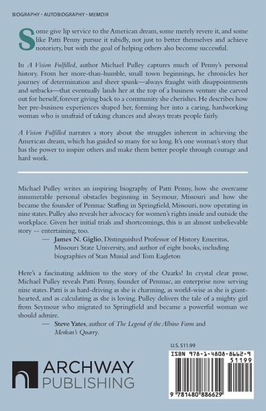 Some give lip service to the American dream, some merely revere it, and some like Patti Penny pursue it rabidly, not just to better themselves and achieve notoriety, but with the goal of helping others also become successful. In A Vision Fulfilled, author Michael Pulley captures much of Penny's personal history. From her more-than-humble, small town beginnings, he chronicles her journey of determination and sheer spunk-always fraught with disappointments and setbacks-that eventually lands her at the top of a business venture she carved out for herself, forever giving back to a community she cherishes. He describes how her pre-business experiences shaped her, forming her into a caring, hardworking woman who is unafraid of taking chances and always treats people fairly. A Vision Fulfilled narrates a story about the struggles inherent in achieving the American dream, which has guided so many for so long. It's one woman's story that has the power to inspire others and make them better people through courage and hard work.