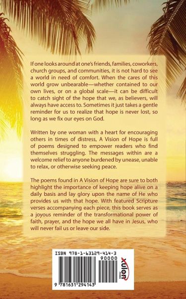 If one looks around at one's friends, families, coworkers, church groups, and communities, it is not hard to see a world in need of comfort. When the cares of this world grow unbearable--whether contained to our own lives, or on a global scale--it can be difficult to catch sight of the hope that we, as believers, will always have access to. Sometimes it just takes a gentle reminder for us to realize that hope is never lost, so long as we fix our eyes on God. Written by one woman with a heart for encouraging others in times of distress, A Vision of Hope is full of poems designed to empower readers who find themselves struggling. The messages within are a welcome relief to anyone burdened by unease, unable to relax, or otherwise seeking peace. The poems found in A Vision of Hope are sure to both highlight the importance of keeping hope alive on a daily basis and lay glory upon the name of He who provides us with that hope. With featured Scripture verses accompanying each piece, this book serves as a joyous reminder of the transformational power of faith, prayer, and the hope we all have in Jesus, who will never fail us or leave our side.