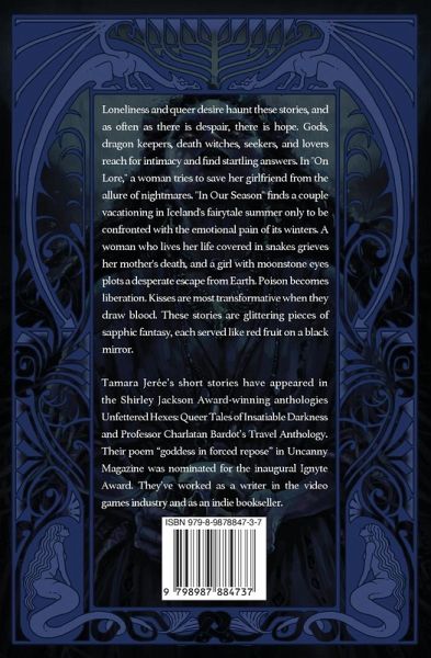 Loneliness and queer desire haunt these stories, and as often as there is despair, there is hope. Gods, dragon keepers, death witches, seekers, and lovers reach for intimacy and find startling answers. In "On Lore," a woman tries to save her girlfriend from the allure of nightmares. "In Our Season" finds a couple vacationing in Iceland's fairytale summer only to be confronted with the emotional pain of its winters. A woman who lives her life covered in snakes grieves her mother's death, and a girl with moonstone eyes plots a desperate escape from Earth. Poison becomes liberation. Kisses are most transformative when they draw blood. These stories are glittering pieces of sapphic fantasy, each served like red fruit on a black mirror.