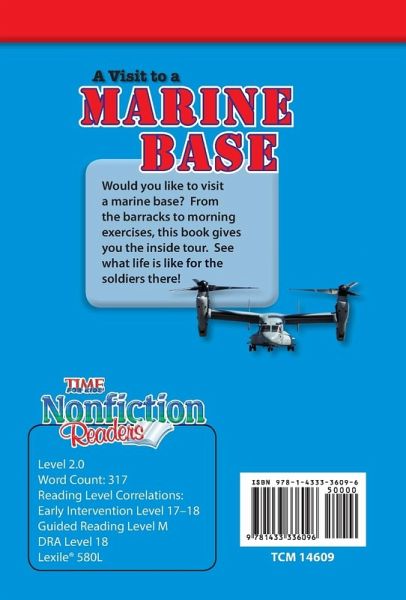 Learn what it's like to live and work on a marine base! In this engaging nonfiction reader, children can discover everything about living on a base--from living in the barracks to how Marines keep in touch with their loved ones. With informational text, plenty of vibrant photos, and stimulating facts, readers will want to learn all about life on a marine base!