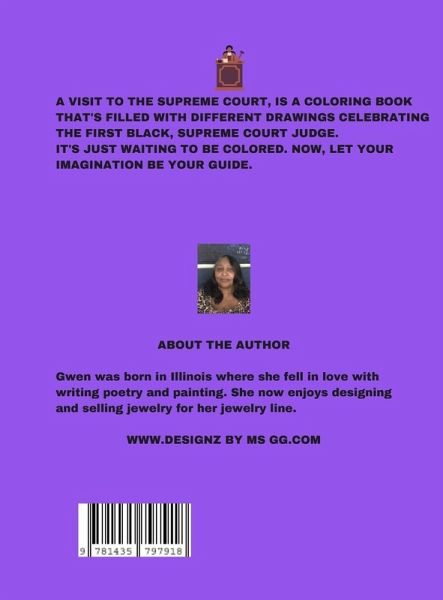 A VISIT TO THE SUPREME COURT, IS A COLORING BOOK THAT'S FILLED WITH DIFFERENT DRAWINGS CELEBRATING THE FIRST BLACK, SUPREME COURT JUDGE. IT'S JUST WAITING TO BE COLORED. NOW, LET YOUR IMAGINATION BE YOUR GUIDE.