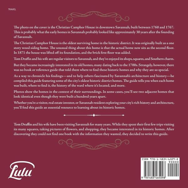 Tom Draffin and his wife are regular visitors to Savannah, and they've enjoyed its shops, squares, and Southern charm. But they became increasingly interested in its old homes, many dating back to the 1700s. Strangely, however, there was no book or reference guide that told them where to find these historic homes and why they are so special. As a way to chronicle his findings-and to help others fascinated by Savannah's architecture and history-he compiled this guide featuring some of the city's oldest historic district homes. The guide tells you when each home was built, where to find it, the history of the ward where it's located, and more. Photos show the homes in the context of their surroundings. In some cases, you'll see two adjacent homes that look identical even though they were built a hundred years apart. Whether you're a visitor or Savannah resident exploring your city's rich history and architecture, you'll find this guide an essential resource to learning about its historic homes.