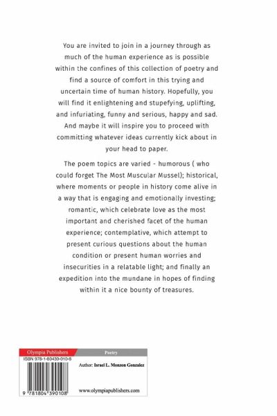 You are invited to join in a journey through as much of the human experience as is possible within the confines of this collection of poetry and find a source of comfort in this trying and uncertain time of human history. Hopefully, you will find it enlightening and stupefying, uplifting, and infuriating, funny and serious, happy and sad. And maybe it will inspire you to proceed with committing whatever ideas currently kick about in your head to paper. The poem topics are varied - humorous ( who could forget The Most Muscular Mussel); historical, where moments or people in history come alive in a way that is engaging and emotionally investing; romantic, which celebrate love as the most important and cherished facet of the human experience; contemplative, which attempt to present curious questions about the human condition or present human worries and insecurities in a relatable light; and finally an expedition into the mundane in hopes of finding within it a nice bounty of treasures.