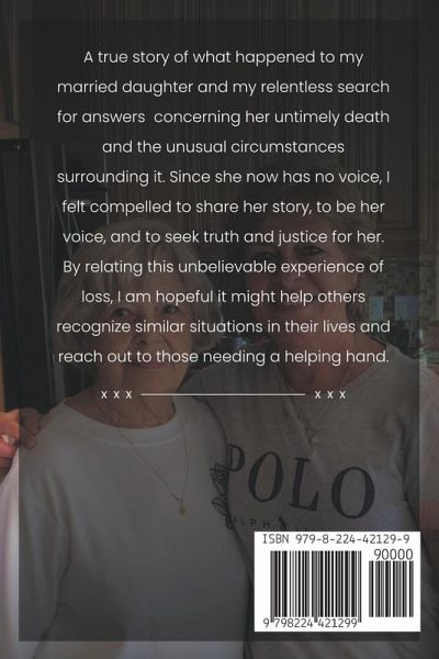 A true story of what happened to my married daughter and my relentless search for answers concerning her untimely death and the unusual circumstances surrounding it. Since she now has no voice, I felt compelled to share her story, to be her voice, and to seek truth and justice for her. By relating this unbelievable experience of loss, I am hopeful it might help others recognize similar situations in their lives and reach out to those needing a helping hand.