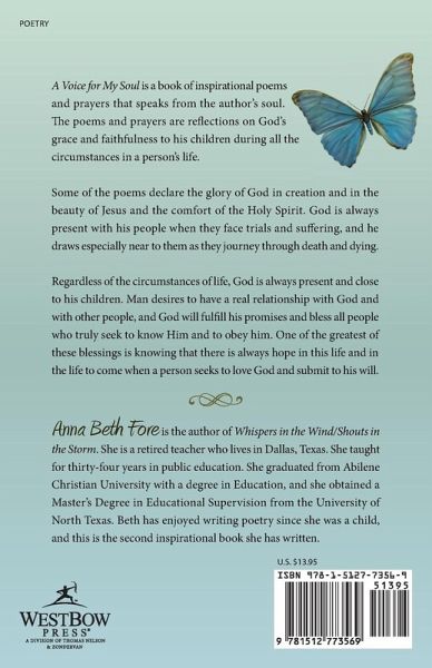 A Voice for My Soul is a book of inspirational poems and prayers that speaks from the author's soul. The poems and prayers are reflections on God's grace and faithfulness to his children during all the circumstances in a person's life. Some of the poems declare the glory of God in creation and in the beauty of Jesus and the comfort of the Holy Spirit. God is always present with his people when they face trials and suffering, and he draws especially near to them as they journey through death and dying. Regardless of the circumstances of life, God is always present and close to his children. Man desires to have a real relationship with God and with other people, and God will fulfill his promises and bless all people who truly seek to know Him and to obey him. One of the greatest of these blessings is knowing that there is always hope in this life and in the life to come when a person seeks to love God and submit to his will.