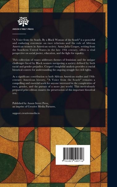 "A Voice from the South, By a Black Woman of the South" is a powerful and enduring statement on race relations and the role of African American women in American society. Anna Julia Cooper, writing from the Southern United States in the late 19th century, offers a vital perspective on social justice, education, and the fight for equality. This collection of essays addresses themes of feminism and the unique challenges faced by Black women navigating a society defined by both racial and gender prejudice. Cooper's insightful analysis provides a crucial historical context for understanding the ongoing struggle for civil rights. As a significant contribution to both African American studies and 19th-century American history, "A Voice from the South" remains a compelling and essential work for anyone interested in the complexities of race, gender, and the pursuit of a more just world. This meticulously prepared print edition ensures the preservation of this important historical text. This work has been selected by scholars as being culturally important, and is part of the knowledge base of civilization as we know it. This work is in the public domain in the United States of America, and possibly other nations. Within the United States, you may freely copy and distribute this work, as no entity (individual or corporate) has a copyright on the body of the work. Scholars believe, and we concur, that this work is important enough to be preserved, reproduced, and made generally available to the public. We appreciate your support of the preservation process, and thank you for being an important part of keeping this knowledge alive and relevant.