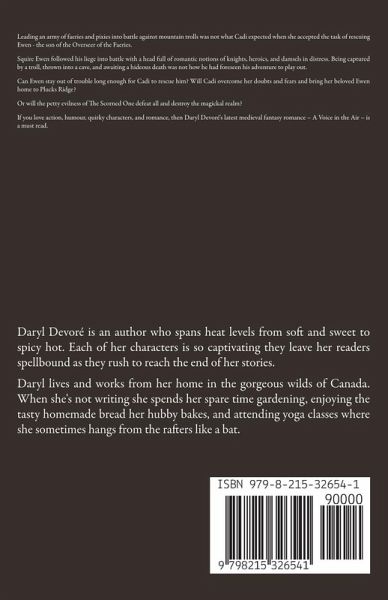 Leading an army of faeries and pixies into battle against mountain trolls was not what Cadi expected when she accepted the task of rescuing Ewen - the son of the Overseer of the Faeries. Squire Ewen followed his liege into battle with a head full of romantic notions of knights, heroics, and damsels in distress. Being captured by a troll, thrown into a cave, and awaiting a hideous death was not how he had foreseen his adventure to play out. Can Ewen stay out of trouble long enough for Cadi to rescue him? Will Cadi overcome her doubts and fears and bring her beloved Ewen home to Plucks Ridge? Or will the petty evilness of The Scorned One defeat all and destroy the magickal realm? If you love action, humour, quirky characters, and romance, then Daryl Devoré's latest medieval fantasy romance - A Voice in the Air - is a must read.