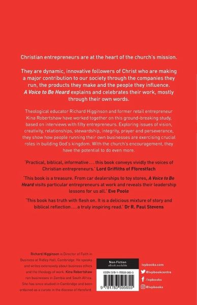 Christian entrepreneurs are at the heart of the church's mission. They are dynamic, innovative followers of Christ who are making a major contribution to our society through the companies they run, the products they make and the people they influence. A Voice to Be Heard explains and celebrates their work, mostly through their own words. Theological educator Richard Higginson and former retail entrepreneur Kina Robertshaw have worked together on this ground-breaking study, based on interviews with fifty entrepreneurs. Exploring issues of vision, creativity, relationships, stewardship, integrity, prayer and perseverance, they show how people running their own businesses are exercising crucial roles in building God's kingdom. With the church's encouragement, they have the potential to do even more. 'Practical, biblical, informative . . . this book conveys vividly the voices of Christian entrepreneurs.' Lord Griffiths of Fforestfach 'This book is a treasure. From car dealerships to toy stores, A Voice to Be Heard visits particular entrepreneurs at work and reveals their leadership lessons for us all.' Eve Poole 'This book has truth with flesh on. It is a delicious mixture of story and biblical reflection . . . a truly inspiring read.' Dr R. Paul Stevens
