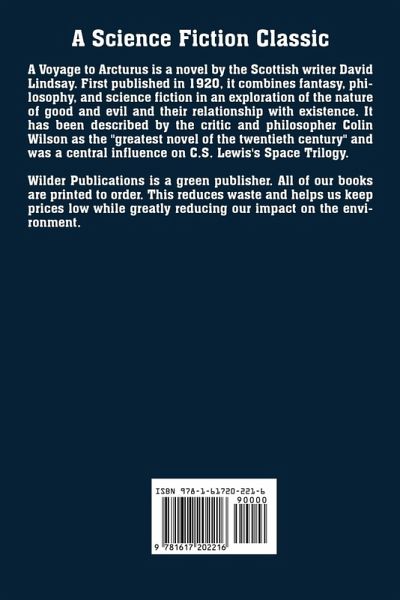 A Voyage to Arcturus is a novel by the Scottish writer David Lindsay. First published in 1920, it combines fantasy, philosophy, and science fiction in an exploration of the nature of good and evil and their relationship with existence. It has been described by the critic and philosopher Colin Wilson as the "greatest novel of the twentieth century" and was a central influence on C.S. Lewis's Space Trilogy. Wilder Publications is a green publisher. All of our books are printed to order. This reduces waste and helps us keep prices low while greatly reducing our impact on the environment.